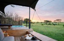 The private wooden deck includes sunken seating, an outdoor shower, and a stunning corner plunge pool with sweeping views of the Serengeti’s beautiful grasslands.