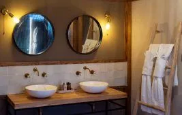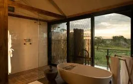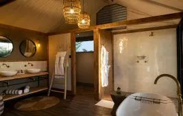 The 15 lavish guest tents (13 standard suites and 1 two-bedroom suite) are set far apart to ensure privacy. Five of the suites include extra day beds for triple occupancy, and the two-bedroom suite is ideal for families or friends. Each tent features a large bed, a spacious lounge area, and a generous bathroom with a double vanity, indoor and outdoor showers, and a freestanding bathtub.