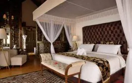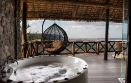 Each of the 50 suites and 2-bedroom luxury villas offers panoramic views of the surrounding landscape. The rooms are elegantly furnished and come with all the amenities you’d expect from a 5-star lodge, including both indoor and outdoor showers, a bathtub, air conditioning, fireplaces, Wi-Fi, a minibar, a safe, and a private balcony.