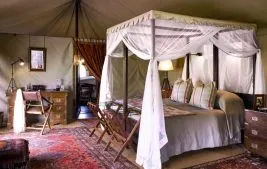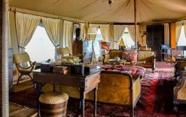 Singita Sabora Tented Camp features 9 en-suite tents, each elegantly furnished with a collection of antiques, original campaign furniture, Zanzibari chests, Persian rugs, and an array of crystal, silverware, and brass.