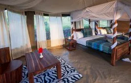 As one of the few luxury vintage safari camps in the park, the camp offers twelve fully furnished deluxe tents. Each tent is equipped with en-suite facilities, including a shower, hand basin, and washing amenities. Soaps, shampoos, insect repellents, and a hairdryer are provided.